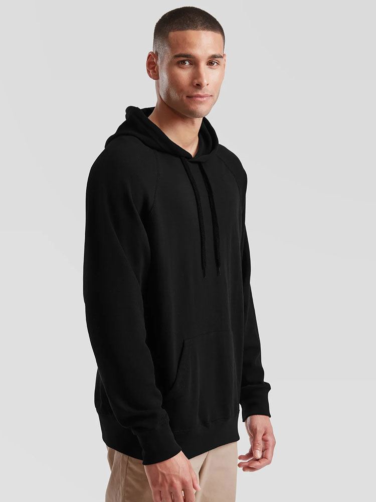 • Lightweight unbrushed fleece,Raglan sleeves,Hood with self-coloured flat draw cord,Front pouch pocket,Waist and cuff in cotton/Lycra(R) rib